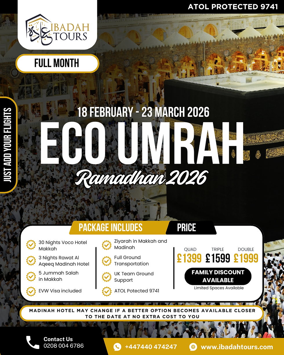 Due to the high demand for Ramadhan Umrah and the exceptional value of these packages, availability is strictly limited. We strongly recommend booking early to avoid disappointment.